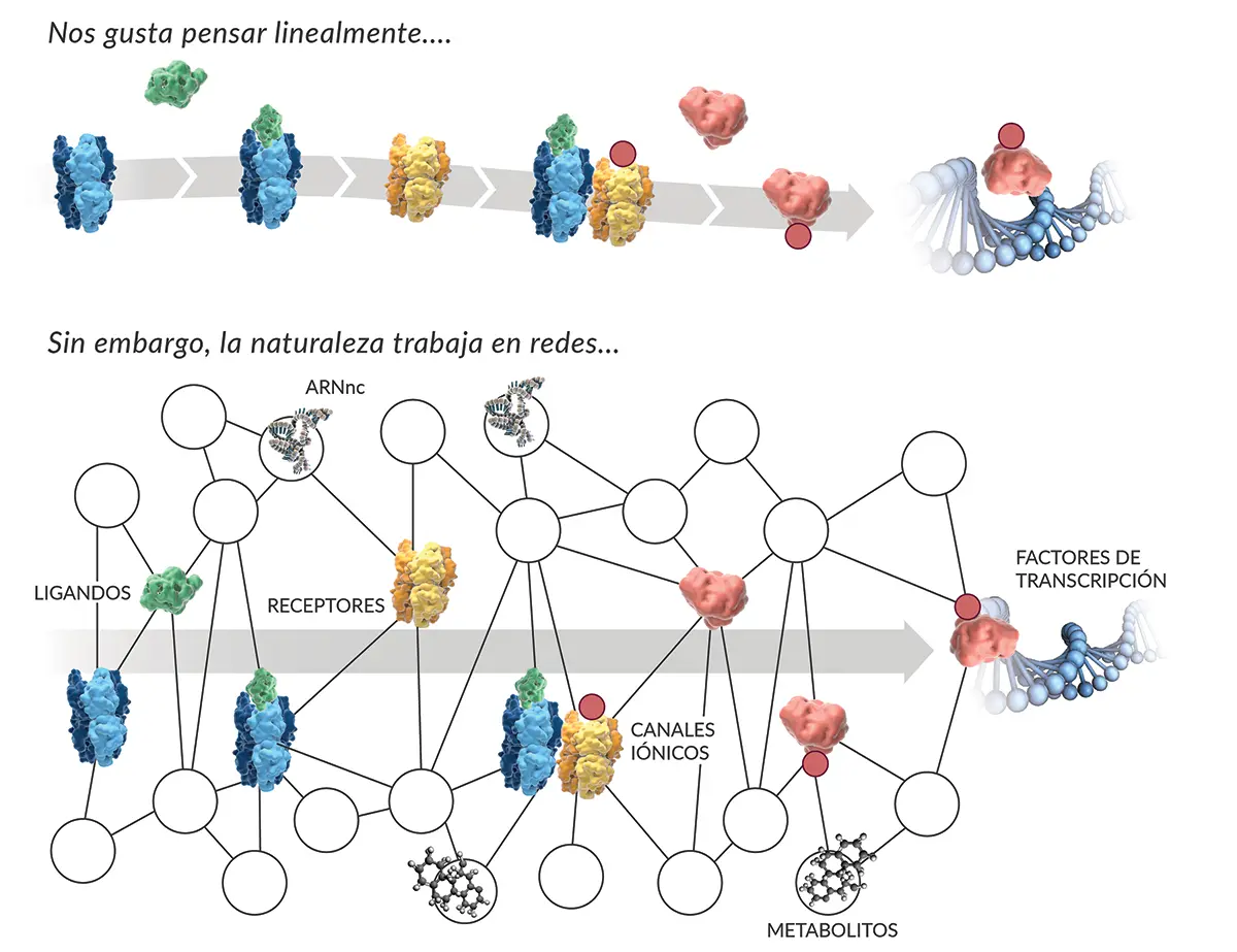 Los campos de la biología molecular y la medicina han considerado tradicionalmente la influencia y la causalidad entre entidades relevantes como ocurrencias de manera lineal. Este marco lineal, a menudo denominado perspectiva reduccionista, apoya un enfoque de molécula única y objetivo único, en el cual un componente biológico particular (por ejemplo, un receptor, un gen, etc.) se considera de manera individual y aislada al tratar enfermedades. Más recientemente, los avances tecnológicos modernos han permitido una comprensión más integral de la interconexión fundamental de los sistemas biológicos, lo que ha llevado a una re-conceptualización hacia un modelo no lineal y basado en sistemas de fisiología y fisiopatología. Esta visión integradora reconoce las interdependencias espaciales y temporales entre múltiples procesos moleculares y fisiológicos, afirmando que un enfoque médico más efectivo utiliza redes biológicas al tratar enfermedades.