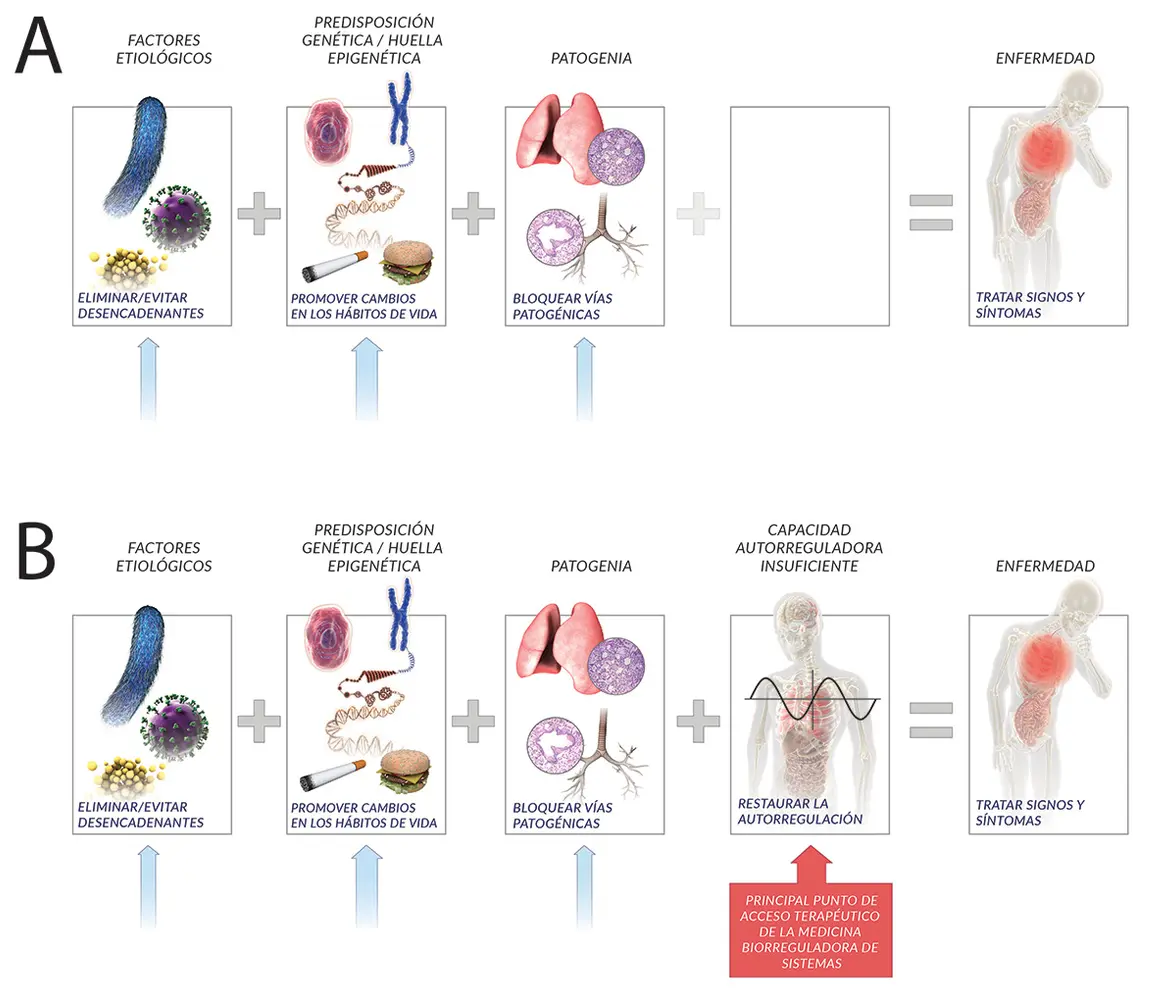 Los paradigmas médicos actuales (A) típicamente, consideran como factores clave para causar enfermedad a los agentes etiológicos, la predisposición genética y las vías moleculares reclutadas en la patogenia.