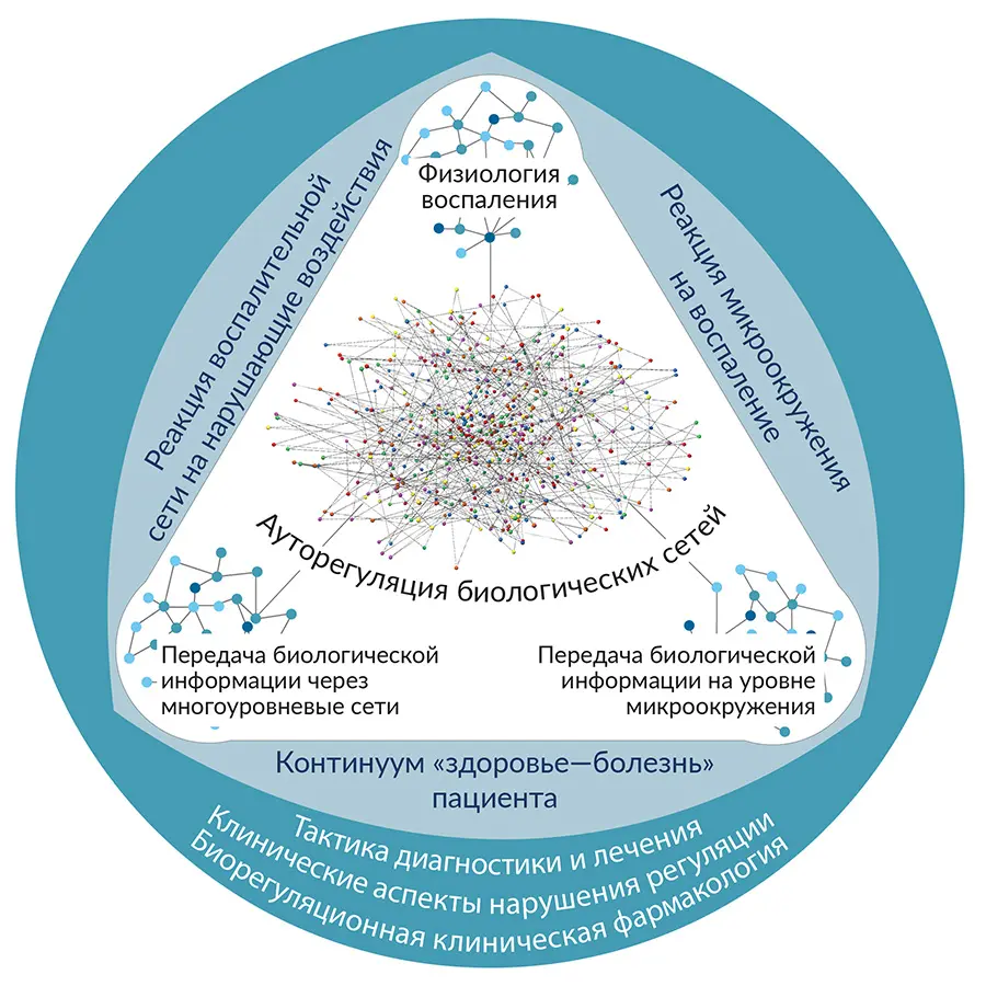 Представленная на рисунке модель состоит из трех интегрированных друг с другом уровней, являющихся частями единого целого. Центральное ядро состоит из четырех блоков ауторегуляции (белый цвет). Его окружает слой блоков нарушения регуляции (голубой цвет), который, в свою очередь, окружен внешним слоем терапевтических блоков (темно-синий цвет). Таким образом, модель отражает важные фундаментальные основы биологии человека, которые в результате создают клиническую картину у каждого конкретного пациента. Правильное понимание этой клинической картины помогает принимать индивидуализированные клинические решения, основываясь на глубинных причинах заболевания. Подробно эта модель объясняется в тексте.