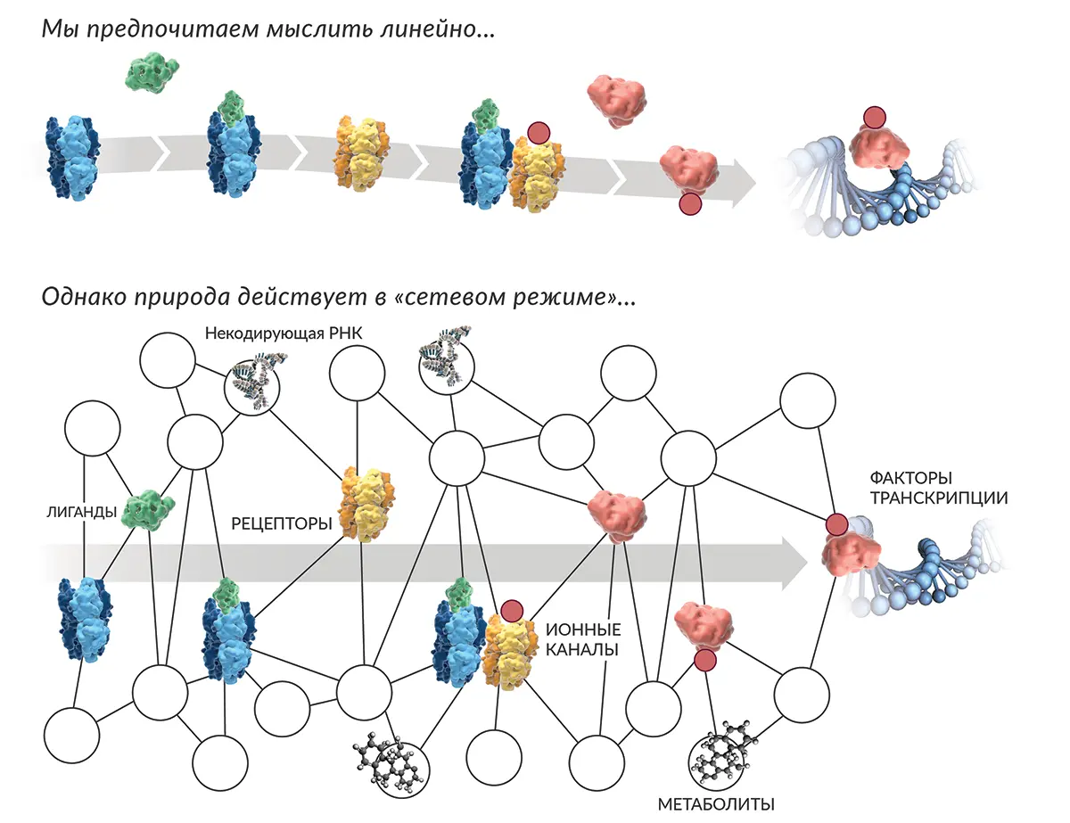 В молекулярной биологии и медицине причинно-следственные связи между объектами и их влияние друг на друга традиционно рассматриваются как происходящие линейно. Этот линейный взгляд, который часто называют редукционизмом, поддерживает подход, направленный на отдельную молекулу и отдельную мишень, когда конкретный биологический элемент (например, рецептор, ген и т. п.) при лечении заболевания рассматривается отдельно, в изоляции от других элементов. В последнее время развитие современных технологий позволило глубже понять фундаментальную взаимосвязанность биологических систем и побудило к созданию новых концепций, опирающихся на нелинейную, системную модель физиологических и патофизиологических процессов. Этот интегративный подход учитывает пространственно-временные взаимозависимости между множеством молекулярных и физиологических процессов и утверждает, что более эффективен подход к лечению заболеваний, учитывающий наличие биологических сетей.