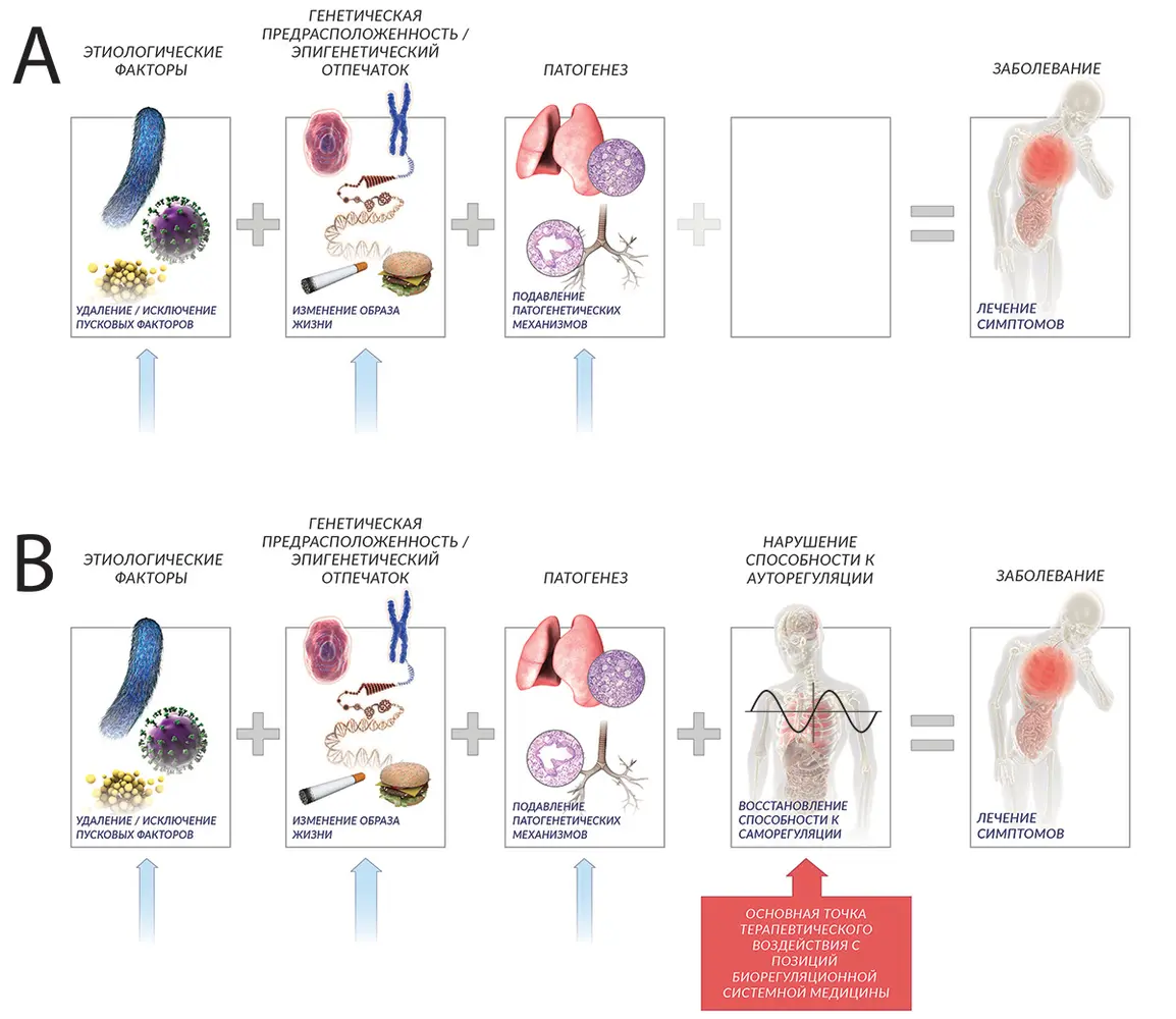 Сегодняшние медицинские парадигмы (A) обычно рассматривают этиологические факторы, генетическую предрасположенность и молекулярные пути, участвующие в патогенезе, как ключевые факторы, приводящие к заболеванию. Биорегуляционная системная медицина (B), помимо этого, учитывает в качестве ключевого фактора, влияющего на возникновение и проявление заболеваний у конкретного пациента, нарушенную или недостаточную способность его организма к ауторегуляции, что препятствует восстановлению гомеостаза. Поэтому восстановление способности организма пациента к ауторегуляции в биорегуляционной системной медицине является одной из основных целей лечения, в дополнение к устранению триггерных факторов, изменению образа жизни и, в необходимых случаях, ингибированию патогенетических путей.